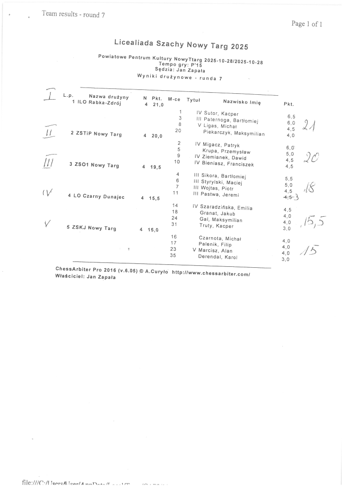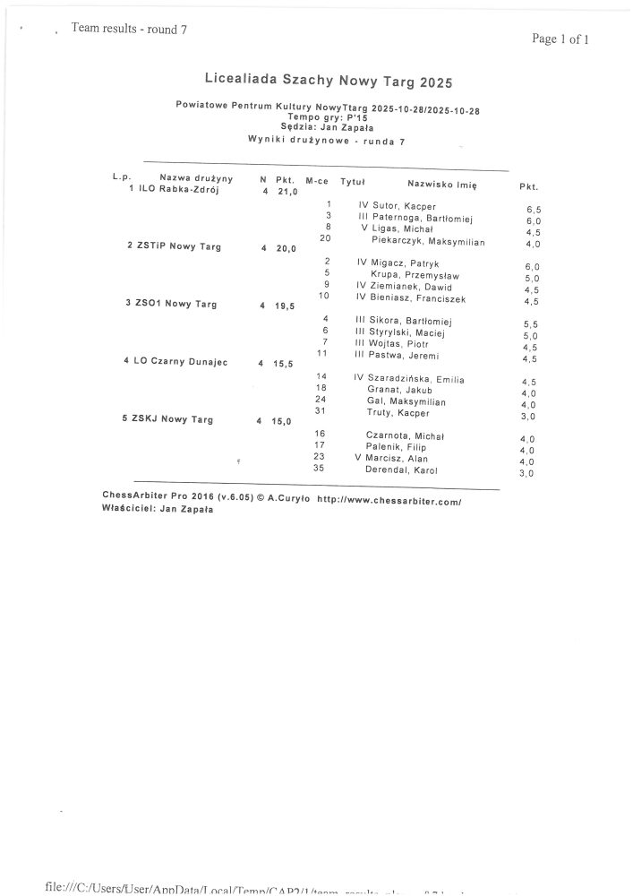 Drużynowo zwyciężyła reprezentacja ILO Rabka Zdrój wyprzedzając ZSTiP Nowy Targ oraz ZSO nr I Nowy Targ.