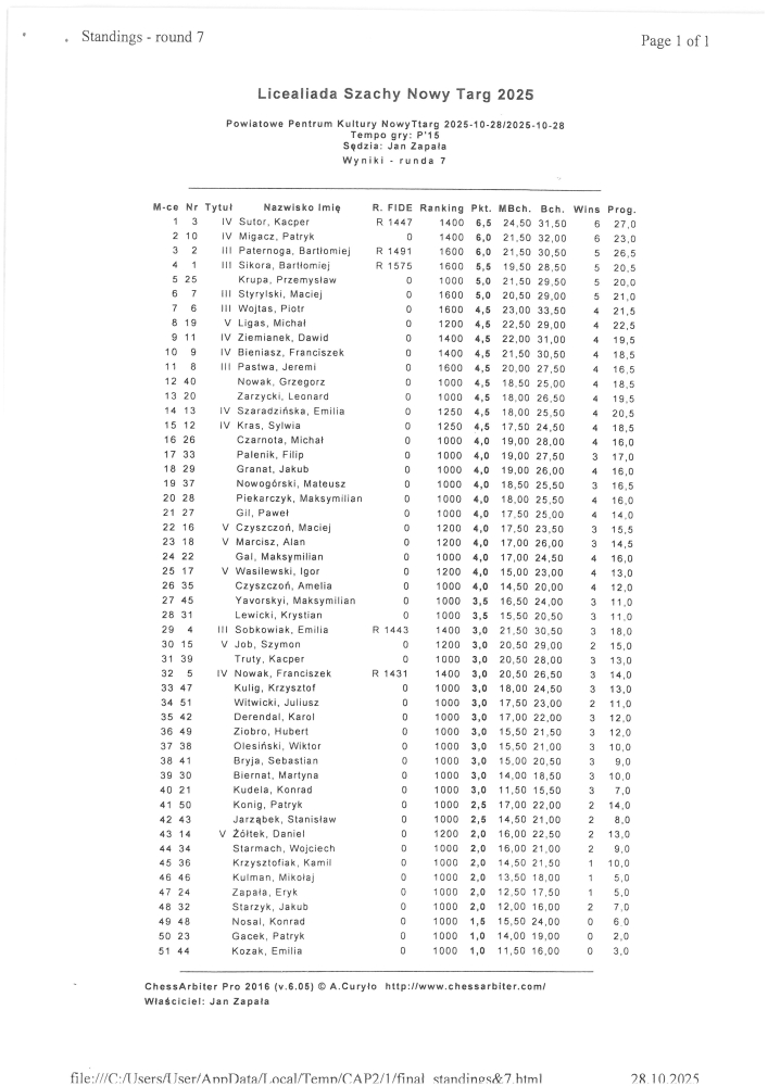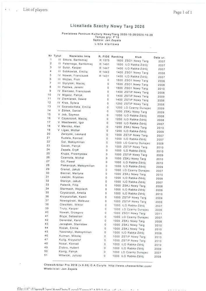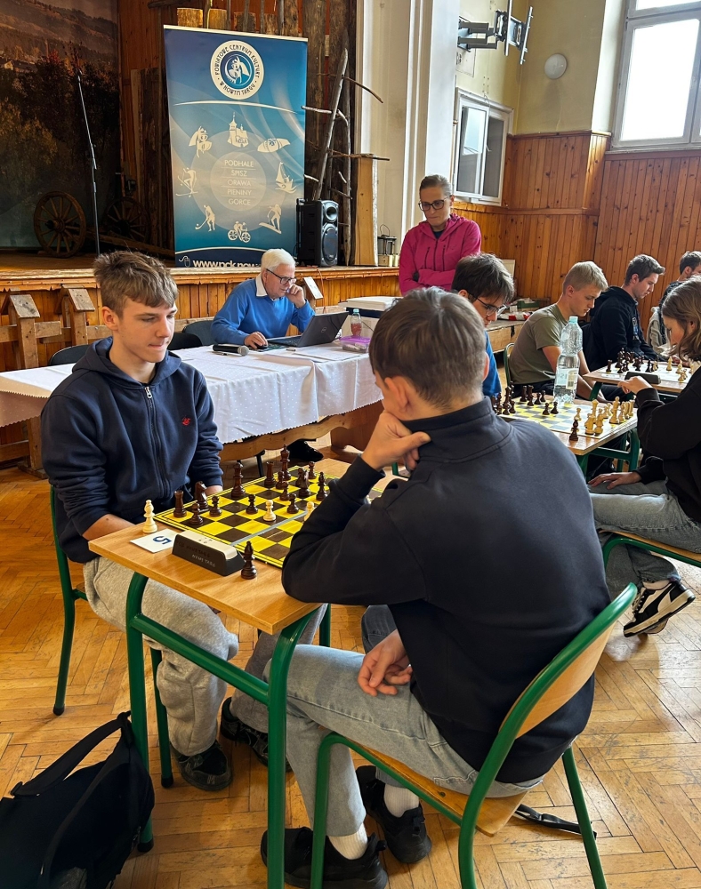 Zmagania młodzieży szkół średnich w królewskiej dyscyplinie – szachy indywidualne oraz drużynowe, które odbyły się 28 października 2025 r w siedzibie Powiatowego Centrum Kultury w Nowym Targu jako głównego organizatora