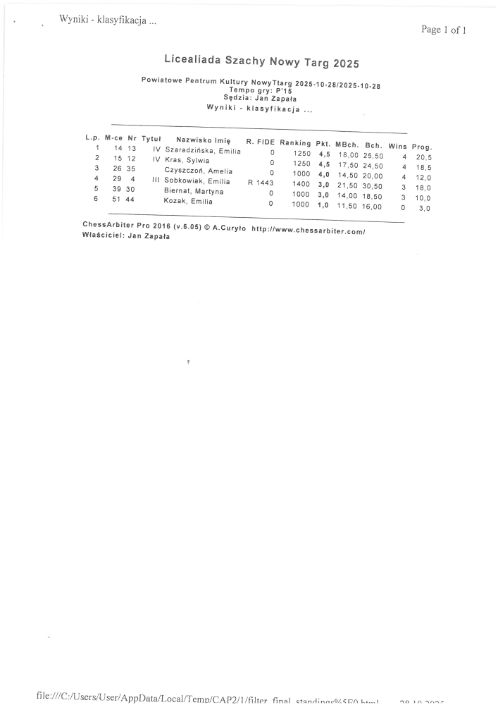 Powiatowa Licealiada w Szachach pod patronatem Starosty Powiatu Nowotarskiego oraz Burmistrza Miasta Nowy Tar